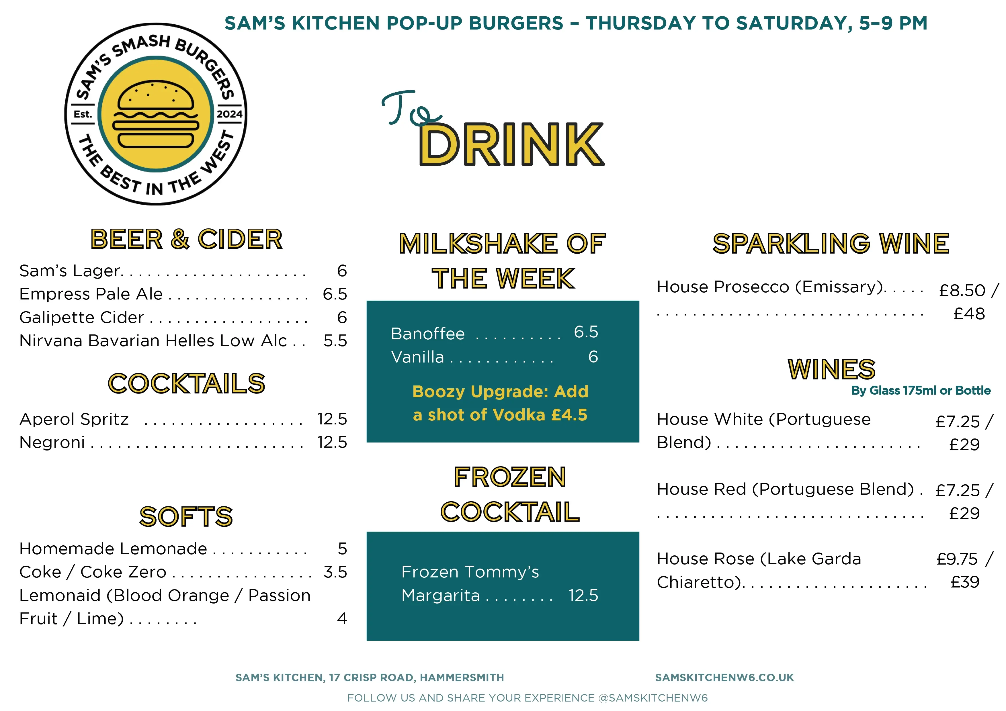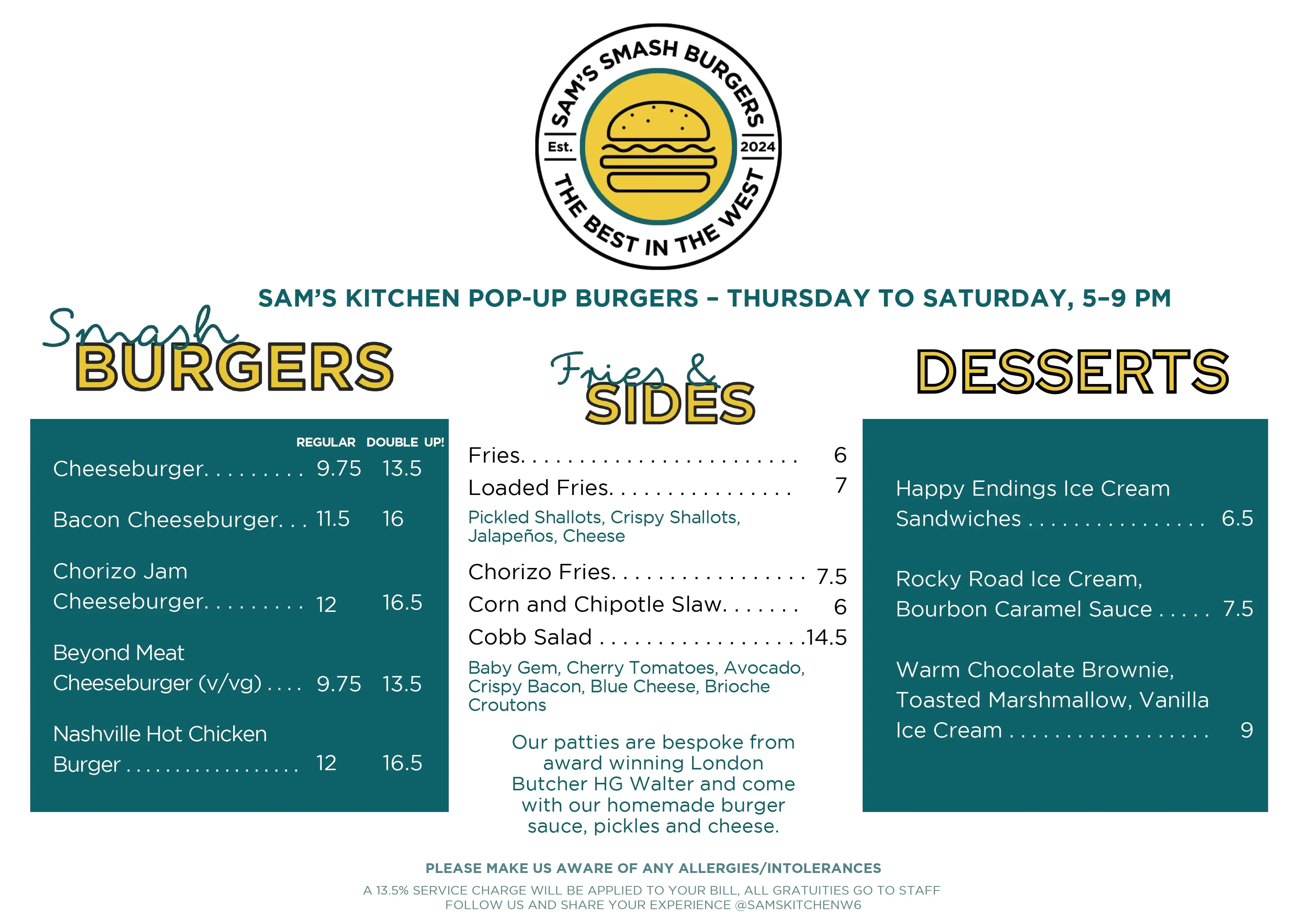 Join us for your smash burger fix, along with loaded fries, beers and cocktails, every Thursday-Saturday evening, from 5pm-9pm.